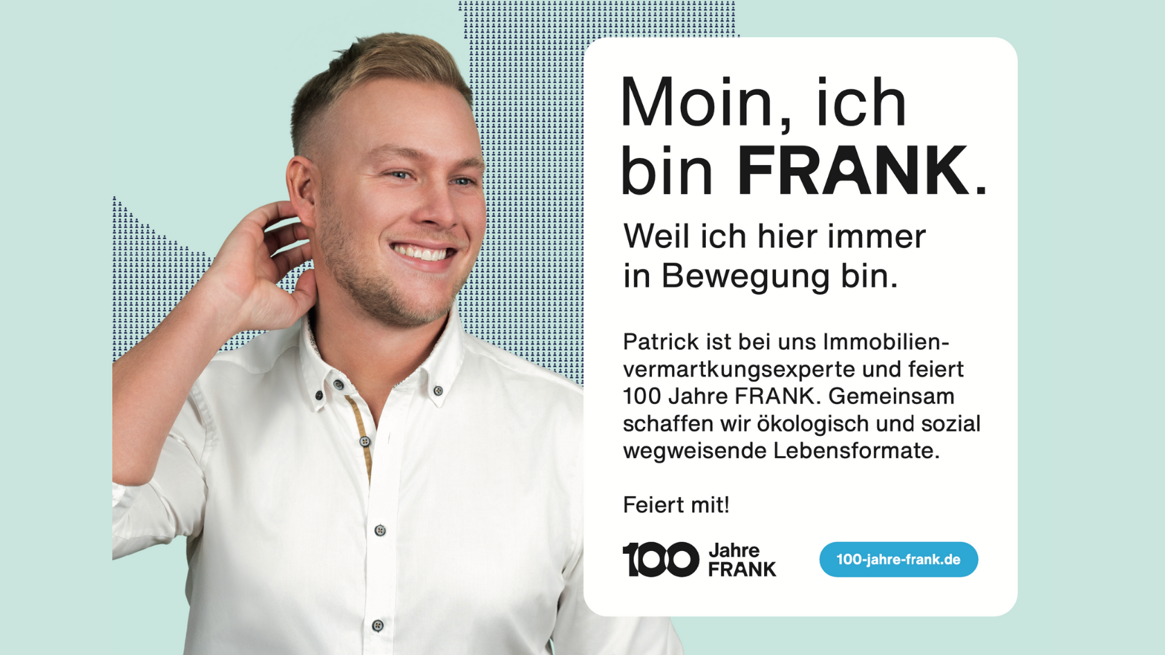 Mit der Kampagne „Ich bin FRANK“ haben wir denjenigen eine Bühne gegeben, die tagtäglich dafür sorgen, dass unsere Vision von nachhaltigen, lebenswerten Räumen Realität wird. Ob im technischen Service, in der digitalen Prozessentwicklung, im Kundenkontakt oder in der Projektentwicklung.